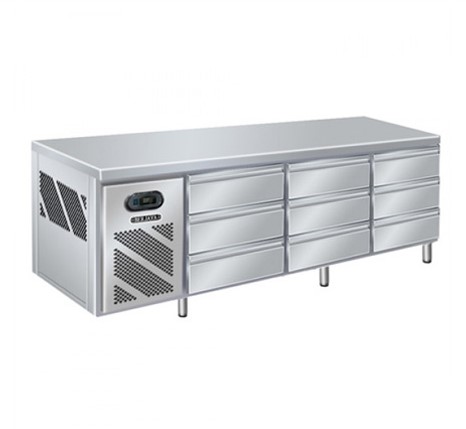 ✨ Bàn mát Berjaya BS 9DR/C2535/3 được thiết kế dạng bàn mát ngang 3 tầng, 9 ngăn kéo chắc chắn, kết hợp mặt bàn trên cùng như một khu vực sơ chế chuyên nghiệp.
