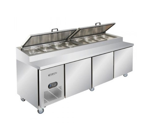 BERJAYA BS 3D/PCF8/Z là dòng bàn mát chuyên dụng cho cửa hàng pizza, có thiết kế kết hợp giữa ngăn mát trữ nguyên liệu bên dưới và mặt bàn + khay topping phía trên, giúp quá trình sơ chế – chế biến pizza diễn ra nhanh gọn, chuyên nghiệp.