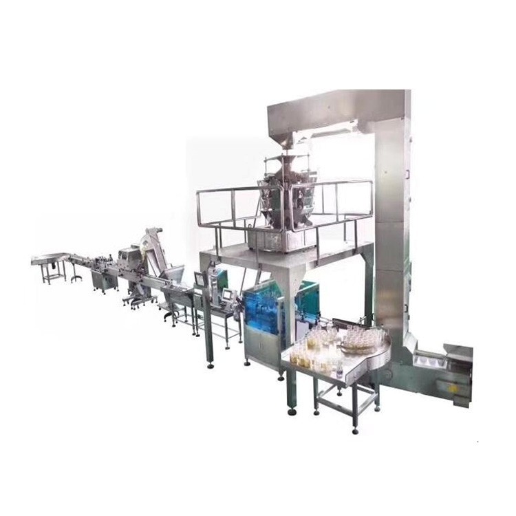 Bàn cấp lon → Thang máy loại Z → Cân nhiều đầu 10 × 1.3L → Bàn làm việc → Máy chiết rót quay → Máy bao và niêm phong lon → Máy in Videojet → Bàn thu gom lon.
