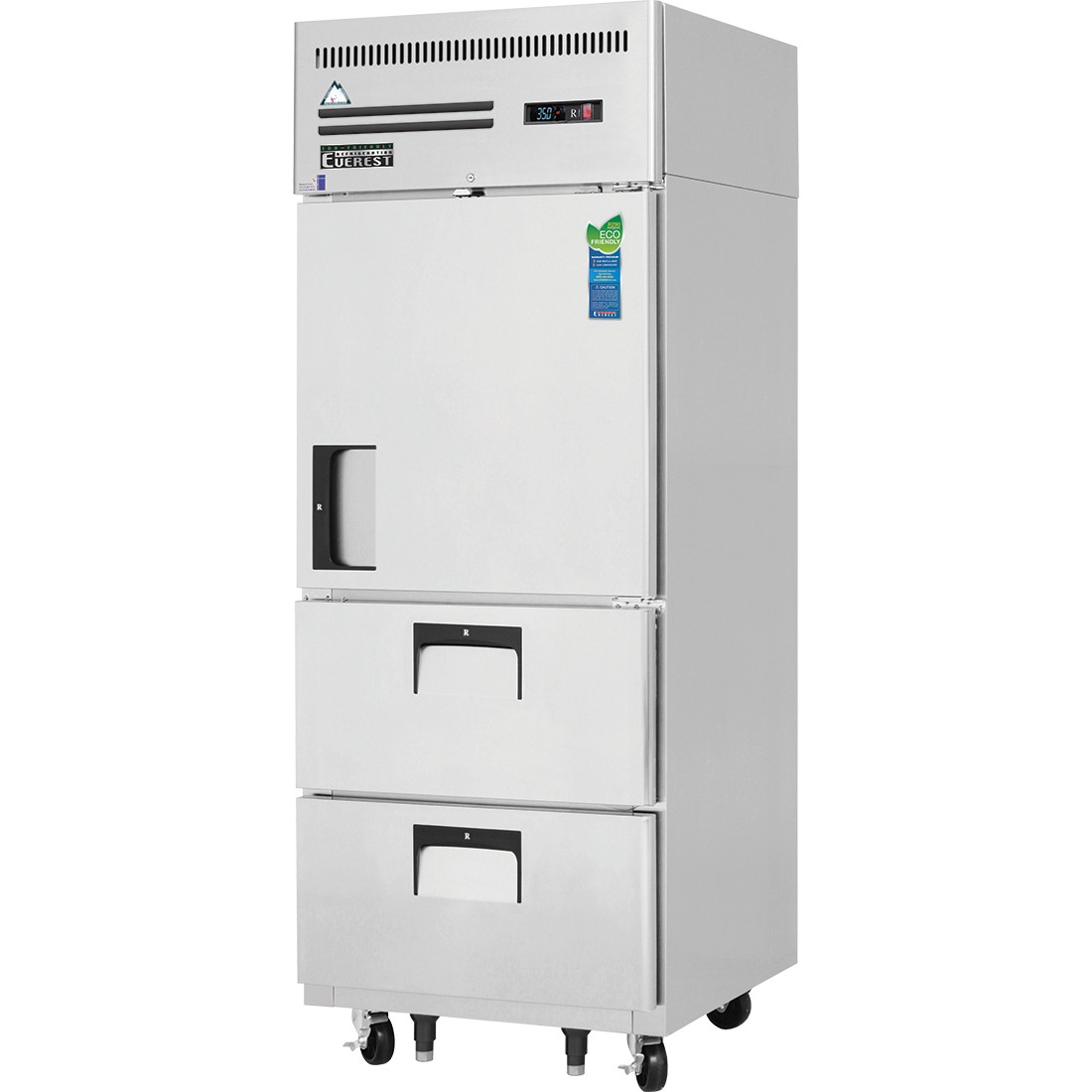 Tủ nằm trong gia đình tủ lạnh đứng gắn trên của Everestref – dòng sản phẩm cung cấp nhiều cấu hình linh hoạt giữa ngăn mát, ngăn đông và nhiệt độ kép, cùng các biến thể cửa đặc, cửa kính, cửa toàn phần, cửa nửa phần và ngăn kéo, đáp ứng đa dạng nhu cầu vận hành thực tế của bếp thương mại.