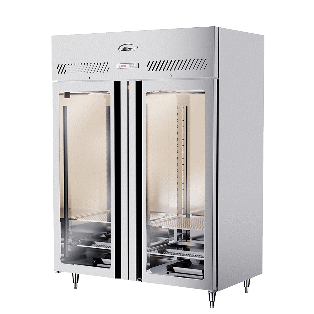 Tủ lạnh lão hóa thịt thẳng đứng Williams BOH-MAR2 với hai cửa kính, nội thất và ngoại thất bằng thép không gỉ, mang đến giải pháp lý tưởng để cung cấp các sản phẩm thịt chất lượng cao.