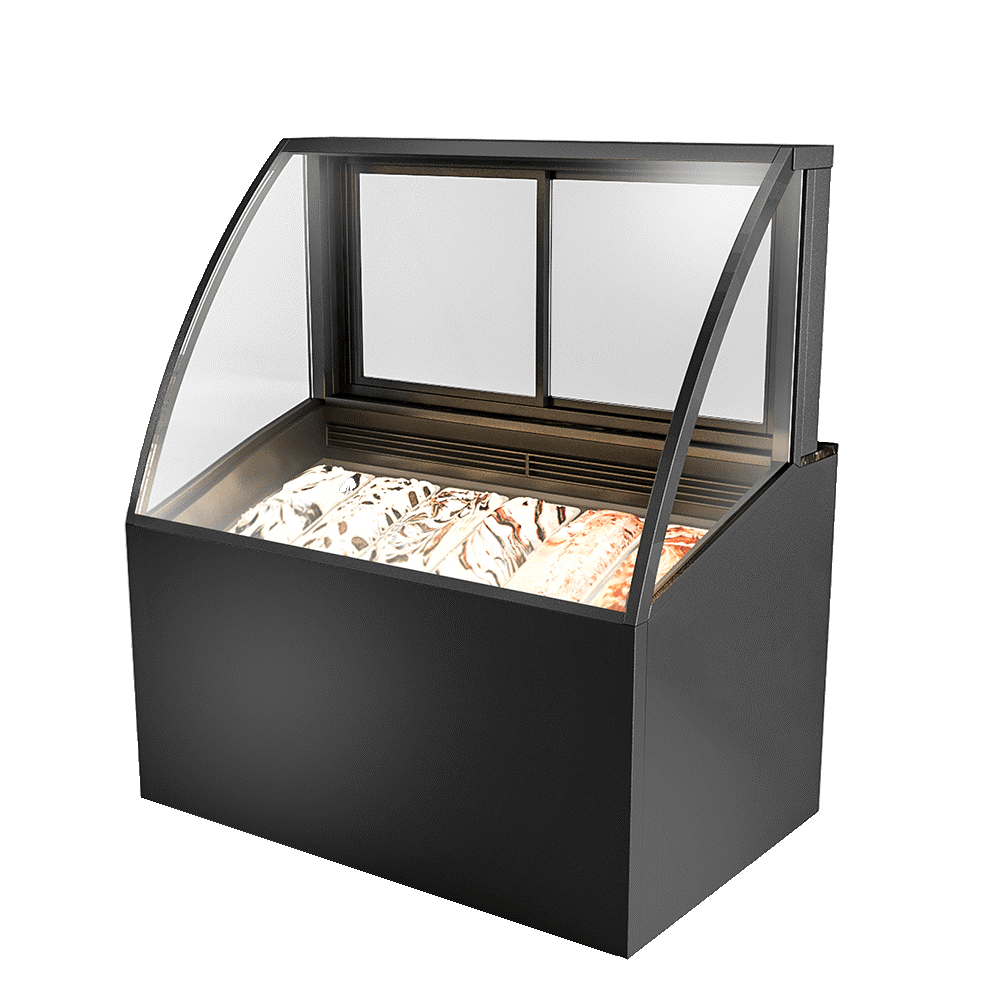 Thiết kế kính cong sang trọng kết hợp mặt bàn đá cẩm thạch hiện đại và đèn LED chiếu sáng tạo ra điểm nhấn thẩm mỹ mạnh mẽ, đồng thời đảm bảo kem luôn giữ được độ mềm mịn và hương vị tuyệt hảo.