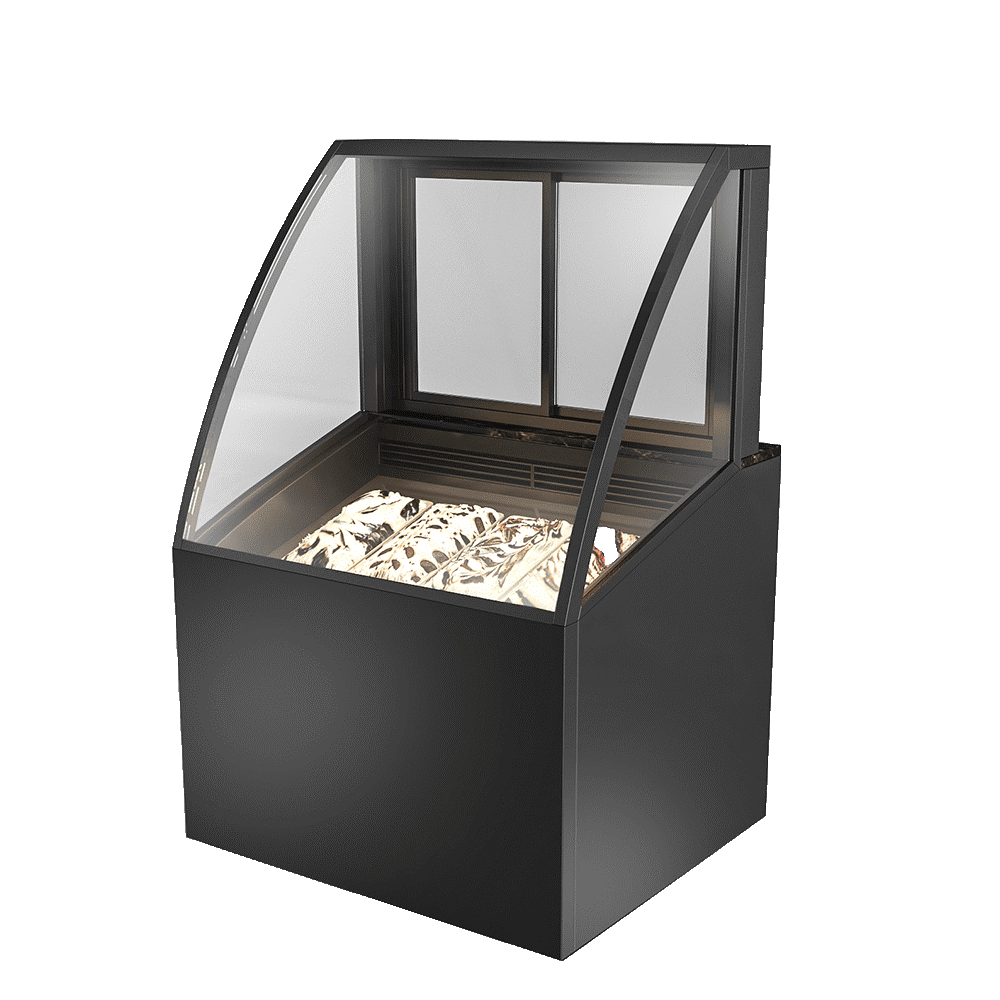🍨 Kính cong hai lớp siêu rõ ràng giúp khách quan sát kem từ nhiều góc mà không bị mờ hay ngưng tụ.