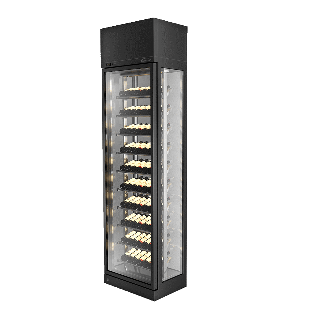 Thiết kế tháp rượu 750mm kết hợp kính cường lực siêu trong bốn mặt và khung thép không gỉ 304 hoàn thiện đen cao cấp, tạo nên một điểm nhấn tinh tế, phù hợp cho không gian hạn chế nhưng yêu cầu thẩm mỹ cao.